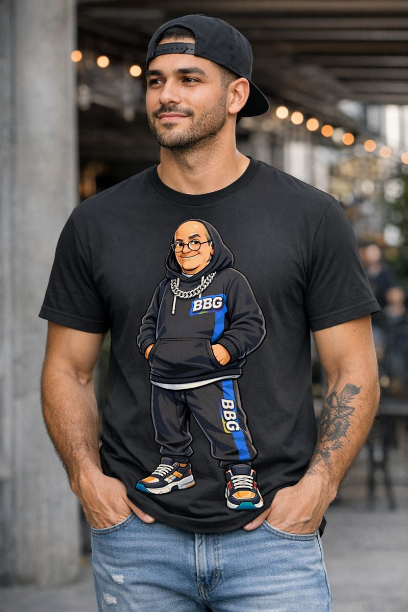 This design features a clean cartoon-style Benjamin Franklin character with an urban streetwear twist. He’s wearing a black BBG hoodie and matching joggers with a vertical blue strip and bold BBG branding on both the chest and pants. He’s rocking chunky sneakers and a large chain, giving the design a confident, playful street vibe. The art is bold, colorful, and print-ready with strong outlines and modern shading. Perfect for tees, hoodies, and merch.